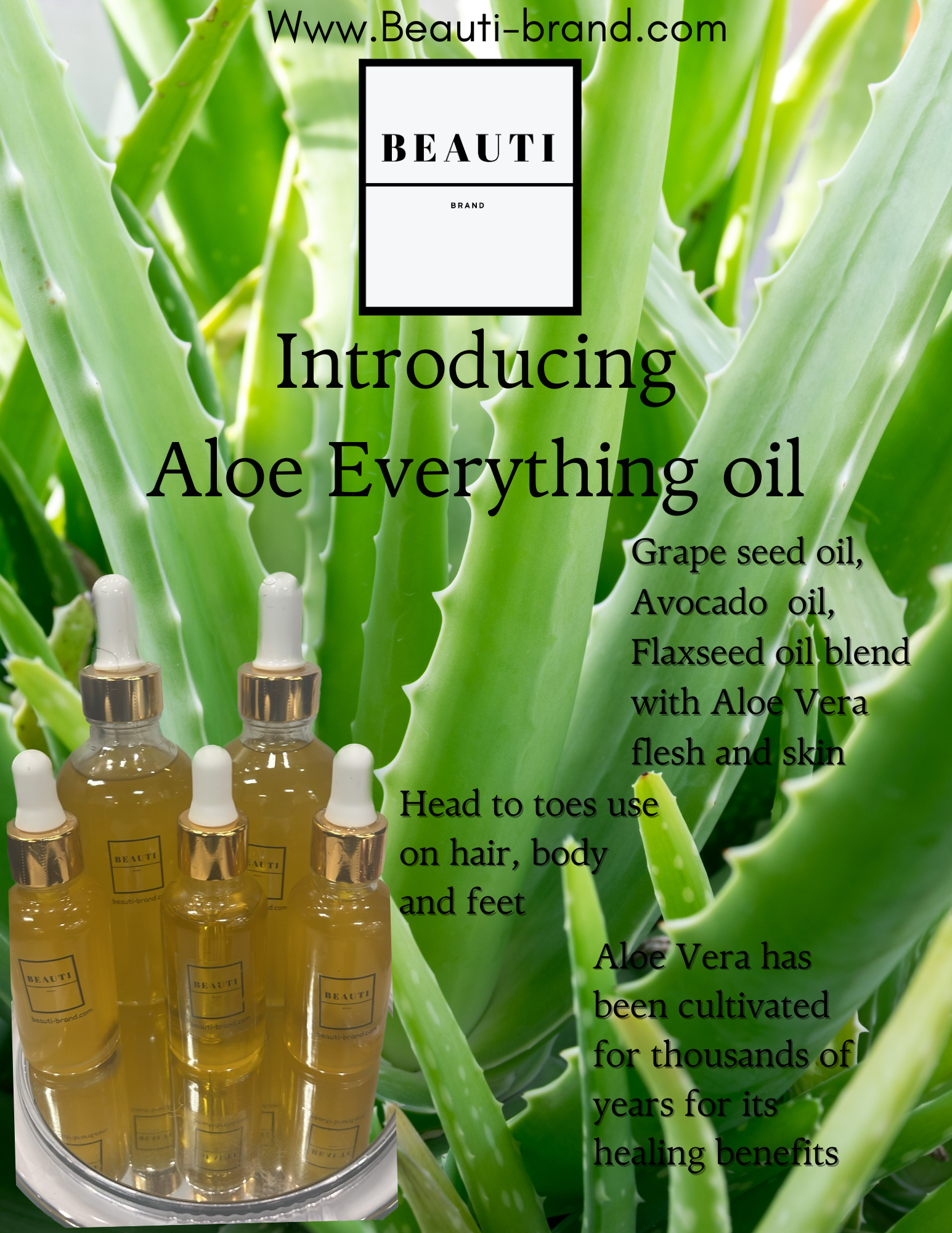 Homemade oil blend of avocado oil, ,grape seed,oil and flaxseed oil with Aloe Vera flesh and leaves fragranced with essential oils. .Beauti-Brand Aloe Everything Oil is for hair, nails, and skin.